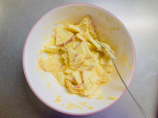 4、 りんごを混ぜます。生地が硬いので混ぜにくいのですが、徐々にりんごの水分で均一に混ざります。