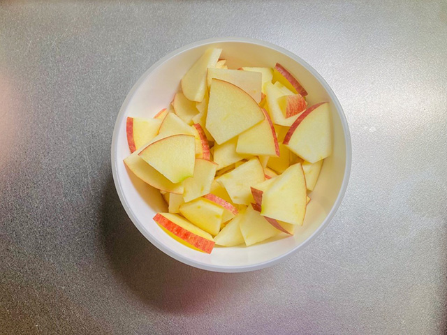 1、 りんごを8等分の薄めのいちょう切りにします。
