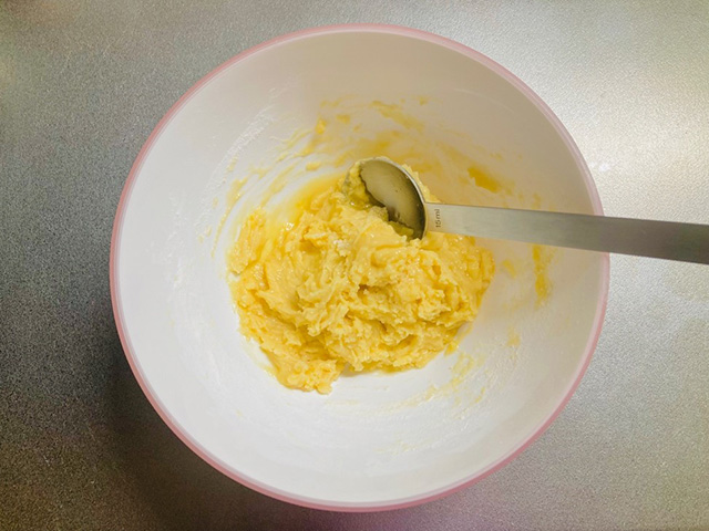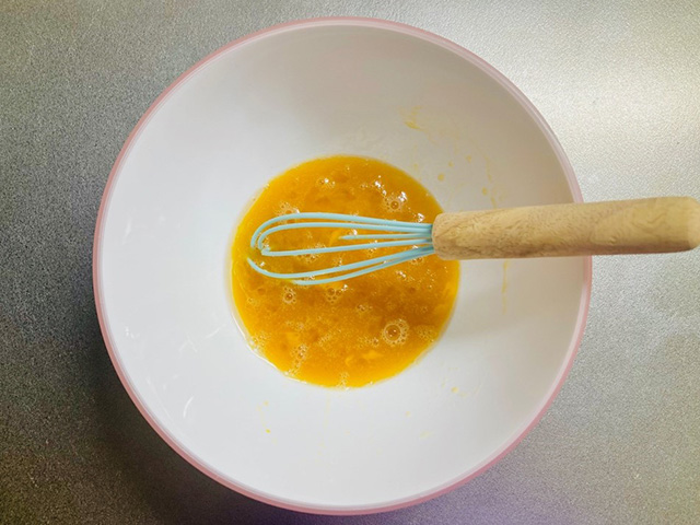 2、 卵、メープルシロップ、米油を泡立て器でよく混ぜます。