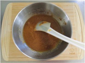 2、 溶かしたバター、ラム酒を加え、よく混ぜます。