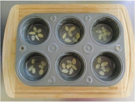 3、 マフィン型にバター(分量外)を塗り、アーモンドスライスを張り付けます。