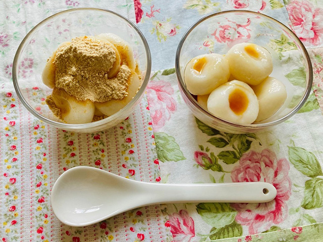 4、冷えた白玉の水気を切り、器に盛り付け、タレやきな粉をかけて完成です。